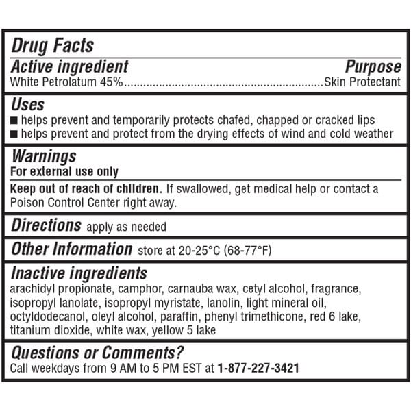 Arachidyl Propionate, Camphor, Carnauba Wax, Cetyl Alcohol, Fragrance, Isopropyl Lanolate, Isopropyl Myristate, Lanolin, Light Mineral Oil, Octyldodecanol, Oleyl Alcohol, Paraffin, Phenyl Trimethicone, Red 6 Lake, Titanium Dioxide, White Wax, Yellow 5 Lake.
