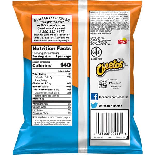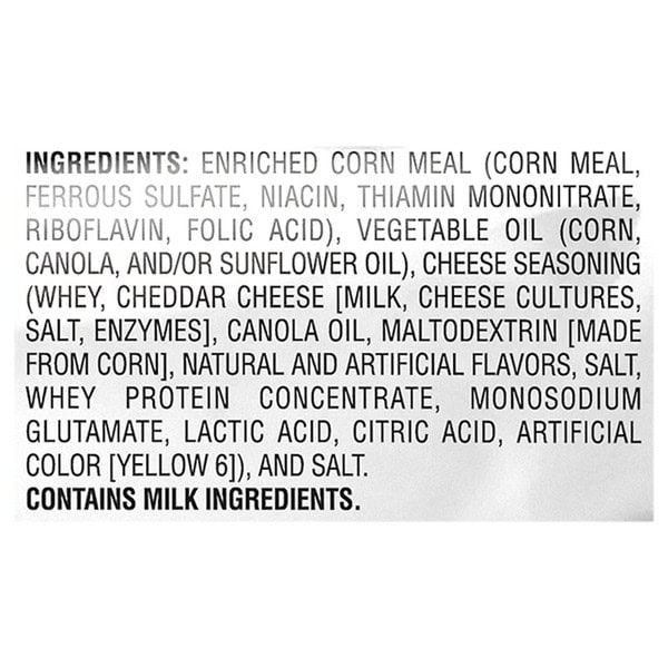 Enriched Corn Meal (corn Meal, Ferrous Sulfate, Niacin, Thiamin Mononitrate, Riboflavin, Folic Acid), Vegetable Oil (corn, Canola, And/or Sunflower Oil), Whey, Cheddar Cheese (milk, Cheese Cultures, Salt, Enzymes), Salt, Corn Maltodextrin, Natural And Artificial Flavors, Whey Protein Concentrate, Monosodium Glutamate, Lactic Acid, Citric Acid, And Artificial Color (yellow 6). Contains Milk Ingred