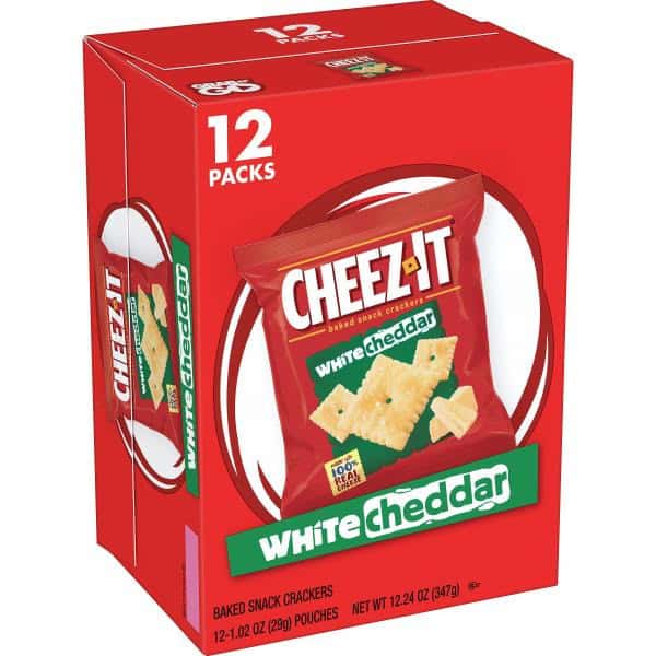 Cheez-It turns up the fun on snack time with deliciously crispy squares made with 100% real cheese in portable pouches. Includes 1, 12.24-ounce caddy containing 12 convenient, individual size pouches of Cheez-It White Cheddar Baked Snack Crackers. Cheez-It bakes cheese into every snack cracker to achieve the perfect melt-in-your-mouth cheesiness and crunch kids and adults crave. Pack travel-ready Cheez-It crackers for school lunch, backpacks, and the office. Grab some to go on family car rides; experience the combination of satisfying saltiness and authentically cheesy flavor in every single-serve pouch of crisp, crunchable, and always munchable Cheez-It White Cheddar Baked Snack Crackers.