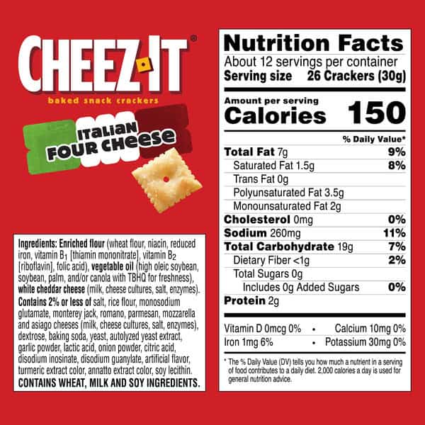 Make snack time more fun with the salty, delicious taste of Cheez-It Italian Four Cheese Baked Snack Crackers. Cheez-It Baked Snack Crackers are made with 100% real cheese that’s been carefully aged for a one-of-a-kind taste in every crunchy bite. A baked snack, Cheez-It crackers are perfect for game time, party spreads, school lunches, late-night snacking and more – the cheesy options are endless. You’ll love the bold flavor of real Romano, Parmesan, Asiago and Mozzarella cheeses in every perfectly toasted handful of Cheez-It Italian Four Cheese Baked Snack Crackers.
