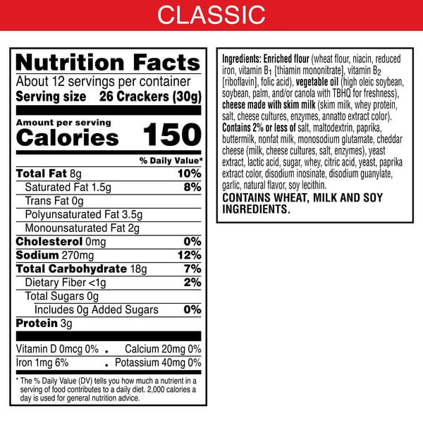 Enriched Flour (wheat Flour, Niacin, Reduced Iron, Vitamin B1 [thiamin Mononitrate], Vitamin B2 [riboflavin], Folic Acid), Vegetable Oil (high Oleic Soybean, Soybean, Palm, And/or Canola With Tbhq For Freshness), Cheese Made With Skim Milk (skim Milk, Whey Protein, Salt, Cheese Cultures, Enzymes, Annatto Extract Color). Contains 2% Or Less Of Salt, Maltodextrin, Paprika, Buttermilk, Nonfat Milk, Monosodium Glutamate, Cheddar Cheese (milk, Cheese Cultures, Salt, Enzymes), Yeast Extract, Lactic Acid, Sugar, Whey, Citric Acid, Yeast, Paprika Extract Color, Disodium Inosinate, Disodium Guanylate, Garlic, Natural Flavor, Soy Lecithin.