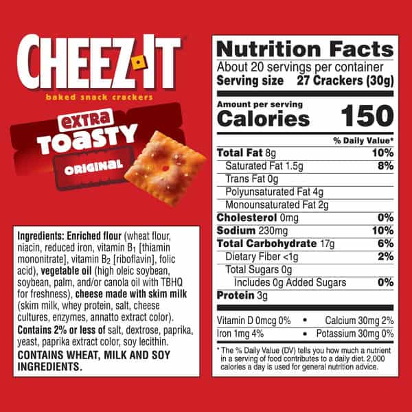 Outrageously cheesy and ridiculously craveable, cheese-lovers reach for Cheez-It Extra Toasty baked snack crackers by the handfuls. Discover a crowd-favorite snack made with 100% real cheese baked extra toasty for an irresistible, crunchy snap in every bite. Each lightly salted crisp is loaded with bold cheesy flavor. Cheez-It baked snack crackers are a fan-favorite for school snacks, video game snacks, late-night snacking, road trips, and so much more, the cheesy options are endless; Go ahead and grab a box of Cheez-It fans’ favorite flavor that’ll keep you coming back for more. Enjoy a cheesy, satisfying crunch whenever you crave a box of your favorite Cheez-It crackers. Show up to a party with Cheez-It Extra Toasty crackers and watch as these crowd-favorites are devoured one by one. Deliciously cheesy, light and crispy, you’ll love that one-of-a-kind toasted, crunch in every delectable bite of Cheez-It Extra Toasty baked snack crackers.