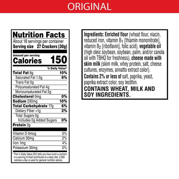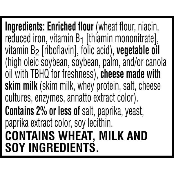 Enriched Flour (wheat Flour, Niacin, Reduced Iron, Vitamin B1 [thiamin Mononitrate], Vitamin B2 [riboflavin], Folic Acid), Vegetable Oil (high Oleic Soybean, Soybean, Palm, And/or Canola Oil With Tbhq For Freshness), Cheese Made With Skim Milk (skim Milk, Whey Protein, Salt, Cheese Cultures, Enzymes, Annatto Extract Color). Contains 2% Or Less Of Salt, Paprika, Yeast, Paprika Extract Color, Soy Lecithin.