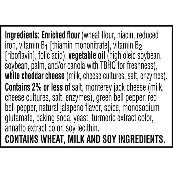 Enriched Flour (wheat Flour, Niacin, Reduced Iron, Vitamin B1 [thiamin Mononitrate], Vitamin B2 [riboflavin], Folic Acid), Vegetable Oil (soybean And Palm Oil With Tbhq For Freshness), White Cheddar Cheese (milk, Cheese Cultures, Salt, Enzymes). Contains 2% Or Less Of Salt, Monterey Jack Cheese (milk, Cheese Cultures, Salt, Enzymes), Green Bell Pepper, Red Bell Pepper, Red Pepper, Monosodium Glutamate, Baking Soda, Yeast, Turmeric Extract Color, Annatto Extract Color, Natural Jalapeno Flavor, Soy Lecithin.