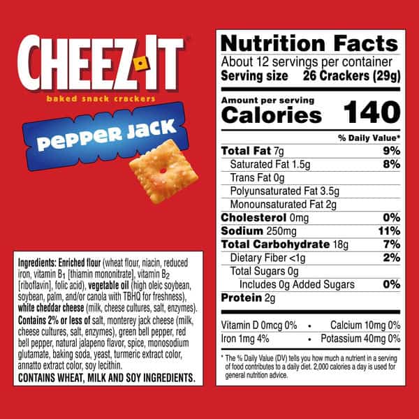 Make snack time more interesting with the fun crunch and delicious, spicy taste of Cheez-It Pepper Jack Baked Snack Crackers. Cheez-It Baked Snack Crackers are made with 100% real cheese that’s been carefully aged for a one-of-a-kind taste in every crunchy bite. A baked snack, Cheez-It crackers are perfect for game time, party spreads, school lunches, late-night snacking and more – the cheesy options are endless. You’ll love the bold flavor of real cheese in every perfectly toasted handful of Cheez-It Pepper Jack Baked Snack Crackers.
