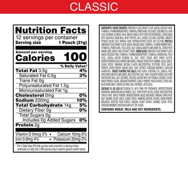 Cheese Crackers (enriched Flour [wheat Flour, Niacin, Reduced Iron, Vitamin B₁ (thiamin Mononitrate), Vitamin B₂ (riboflavin), Folic Acid], Vegetable Oil (high Oleic Soybean, Soybean, Palm, And/or Canola Oil With Tbhq For Freshness), Cheese Made With Skim Milk [skim Milk, Whey Protein, Salt, Cheese Cultures, Enzymes, Annatto Extract Color], Salt, Paprika Yeast, Paprika Extract Color, Soy Lecithin), Pretzels (enriched Flour [wheat Flour, Niacin, Reduced Iron, Vitamin B₁ (thiamin Mononitrate), Vitamin B₂ (riboflavin), Folic Acid], Salt, Canola And/or Sunflower Oil, Corn Syrup, Baking Soda, Barley Malt Extract, Yeast), Bread Slices (enriched Wheat Flour [wheat Flour, Niacin, Reduced Iron, Vitamin B₁ (thiamin Mononitrate), Vitamin B₂ (riboflavin), Folic Acid], Canola And/or Soybean Oil, Salt, Yeast, Sugar, Malt, Wheat Gluten, Worcestershire Sauce Powder [molasses, Vinegar, Corn Syrup, Caramel Color, Garlic, Sugar, Spices, Tamarind, Natural Flavor, Maltodextrin], Dextrose, Spice Garlic Powder, Onion Powder, Baking Soda, Yeast Extract, Disodium Inosinate, Disodium Guanylate), Cheese Flavored Rice Balls (rice Meal, Vegetable Oil [canola, Rice, Safflower And/or Sunflower], Maltodextrin, Salt, Whey, Cheddar Cheese [cultured Pasteurized Milk, Salt, Enzymes], Reduced Lactose Whey, Buttermilk, Natural Flavor, Onion Powder, Sugar, Disodium Phosphate, Garlic Powder, Yeast Extract, Citric Acid, Blue Cheese [milk, Cheese Cultures, Salt, Enzymes], Lactic Acid), Contains 2% Or Less Of Soybean Oil With Tbhq For Freshness, Worcestershire Seasoning (monosodium Glutamate, Salt, Corn Syrup Solids, Sugar, Maltodextrin, Torula Yeast, Garlic Powder, Worcestershire Sauce [molasses, Vinegar, Corn Syrup, Salt, Caramel Color, Garlic, Sugar, Spices, Tamarind, Natural Flavor], Onion Powder, Molasses, Modified Food Starch, Vinegar, Wheat Starch, Caramel Color, Spice, Disodium Inosinate, Disodium Guanylate, Soy Flour)