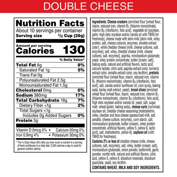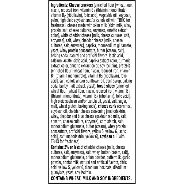 Cheese Crackers (enriched Flour [wheat Flour, Niacin, Reduced Iron, Vitamin B₁ (thiamin Mononitrate), Vitamin B₂ (riboflavin), Folic Acid], Vegetable Oil [soybean, Palm, High Oleic Soybean And/or Canola Oil With Tbhq For Freshness], Cheese Made With Skim Milk [skim Milk, Whey Protein, Salt, Cheese Cultures, Enzymes, Annatto Extract Color], White Cheddar Cheese [milk, Cheese Cultures, Salt, Enzymes], Salt, Whey, Cheddar Cheese [milk, Cheese Cultures, Salt, Enzymes], Paprika, Monosodium Glutamate, Yeast, Whey Protein Concentrate, Butter [cream, Salt], Baking Soda, Natural And Artificial Flavors, Lactic Acid, Calcium Lactate, Citric Acid, Paprika Extract Color, Turmeric Extract Color, Annatto Extract Color, Soy Lecithin), Pretzels (enriched Flour [wheat Flour, Niacin, Reduced Iron, Vitamin B₁ (thiamin Mononitrate), Vitamin B₂ (riboflavin), Folic Acid], Salt, Canola And/or Sunflower Oil, Corn Syrup, Baking Soda, Barley Malt Extract, Yeast), Bread Slices (enriched Wheat Flour [wheat Flour, Niacin, Reduced Iron, Vitamin B₁ (thiamin Mononitrate), Vitamin B₂ (riboflavin), Folic Acid], High Oleic Soybean And/or Canola Oil, Yeast, Salt, Sugar, Malt, Wheat Gluten, Baking Soda), Cheese Curls (cornmeal, Soybean Oil, Cheddar Cheese Seasoning [maltodextrin, Whey, Cheddar And Blue Cheese (pasteurized Milk, Salt, Annatto, Cheese Culture, Enzymes), Corn Starch, Salt, Monosodium Glutamate, Butter (cream), Whey Protein Concentrate, Artificial Flavors, Yellow 5, Yellow 6, Lactic Acid], Salt, Maltodextrin, Yellow 6), Soybean Oil (with Tbhq For Freshness), Contains 2% Or Less Of Cheddar Cheese (milk, Cheese Cultures, Salt, Enzymes), Salt, Whey, Butter (cream, Salt), Monosodium Glutamate, Onion Powder, Buttermilk, Garlic Powder, Nonfat Milk, Natural And Artificial Flavors, Citric Acid, Yellow 5, Yellow 6, Disodium Inosinate, Disodium Guanylate, Yeast, Soy Lecithin