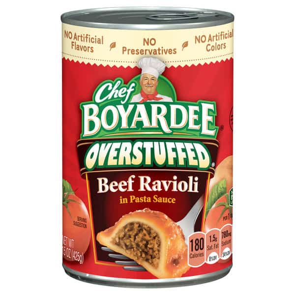 • Chef Boyardee Overstuffed Beef Ravioli contains 2 servings of beef ravioli and tomato sauce in each 15 oz, easy-open can, with 230 calories per serving