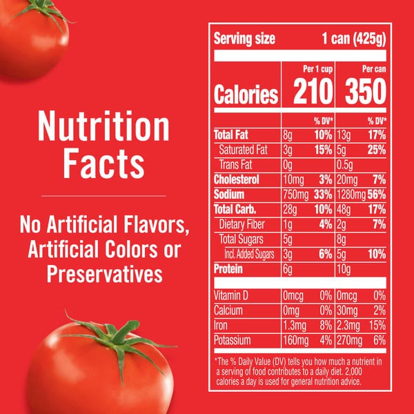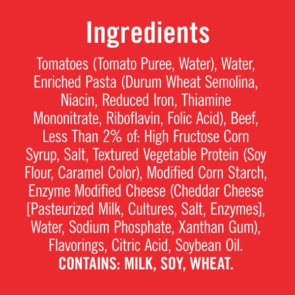 Tomatoes (tomato Puree, Water), Water, Enriched Pasta (durum Wheat Semolina, Niacin, Reduced Iron, Thiamine Mononitrate [vitamin B1], Riboflavin [vitamin B2], Folic Acid), Beef, Less Than 2% Of: High Fructose Corn Syrup, Salt, Textured Vegetable Protein (soy Flour, Caramel Color), Modified Corn Starch, Enzyme Modified Cheese (cheddar Cheese [pasteurized Milk, Cultures, Salt, Enzymes], Water, Sodium Phosphate, Xanthan Gum), Flavorings, Citric Acid, Soybean Oil.
