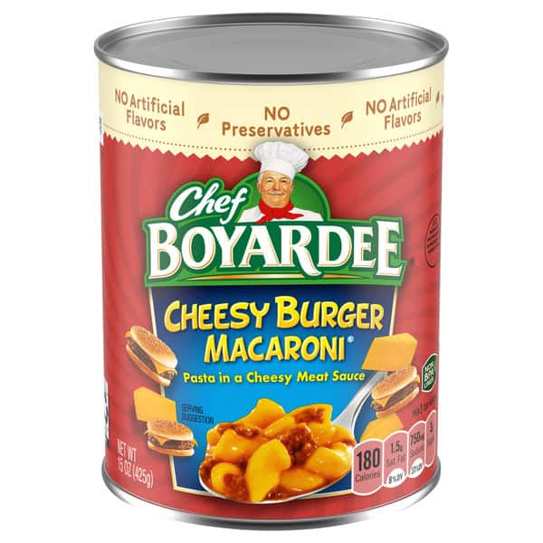 • Packed with 8 grams of protein and 180 calories per serving, Chef Boyardee Cheesy Burger Macaroni contains 2 servings of pasta and cheesy meat sauce in each 15 oz easy-open can