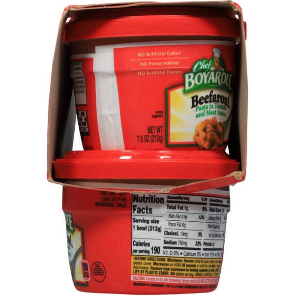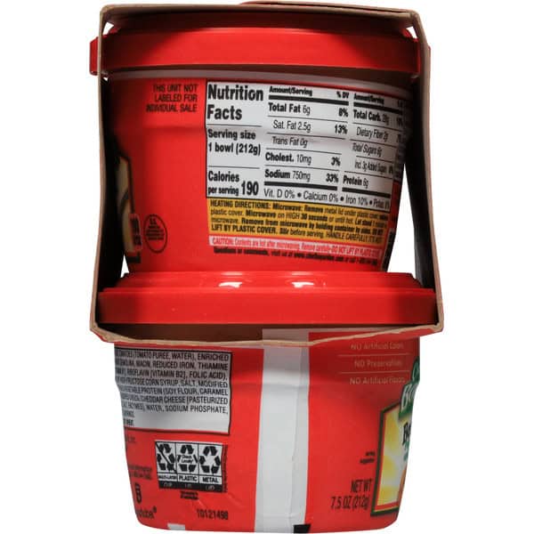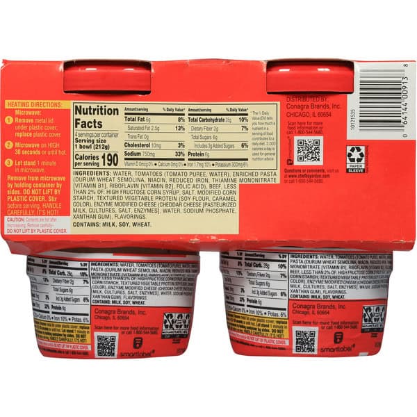Water, Tomatoes (tomato Puree, Water), Enriched Pasta (durum Wheat Semolina, Niacin, Reduced Iron, Thiamine Mononitrate [vitamin B1], Riboflavin [vitamin B2], Folic Acid), Beef, Less Than 2% Of High Fructose Corn Syrup, Salt, Modified Corn Starch, Textured Vegetable Protein (soy Flour, Caramel Color), Enzyme Modified Cheese (cheddar Cheese [pasteurized Milk, Cultures, Salt, Enzymes], Water, Sodium Phosphate, Xanthan Gum), Flavorings