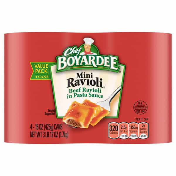 Chef Boyardee Mini Ravioli is a delicious and convenient meal that is ready to eat in minutes and has delighted families for generations. Made with enriched pasta, smothered in rich, Italian-flavored tomato sauce, and stuffed with real beef, Chef Boyardee Mini Ravioli has the timeless flavor everyone loves in a fun, bite-sized package. When you need a quick meal, Chef Boyardee has your back. Just pop the easy-open lid, and in 90 seconds, dinner is ready to serve. Chef Boyardee Mini Ravioli is so simple and easy to prepare, anyone can grab it off the shelf for a quick and filling snack. Each 15 oz, easy-open can of Chef Boyardee Mini Ravioli contains 2 servings of pasta and tomato sauce, with 8 grams of protein and 220 calories per serving. This pack contains 4 cans. With no artificial flavors, colors, or preservatives, Chef Boyardee makes a wholesome meal for kids of ALL ages.