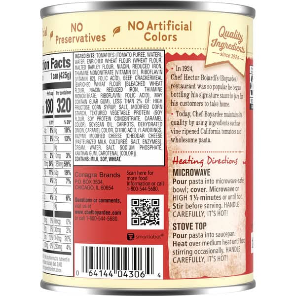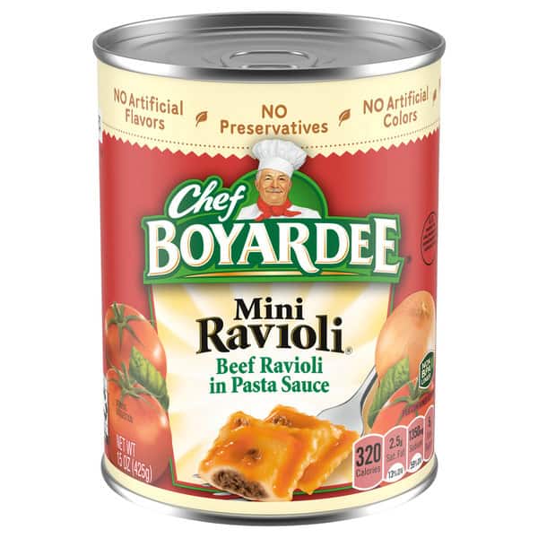 Chef Boyardee Mini Ravioli is a delicious and convenient prepared meal that is ready to eat in minutes and has delighted families for generations. Made with tasty beef ravioli pasta smothered in rich, Italian-flavored pasta sauce, this canned food has the timeless flavor everyone loves in a fun, bite-sized package. Made with no artificial flavors, colors or preservatives, this iconic pantry staple makes a wholesome meal for kids of ALL ages. When you need a quick stove top or microwave meal, grab a can of beef ravioli pasta and in just a few minutes, dinner is ready to serve. Perfect for office or school lunches, easy dinners, or quick and filling snacks, Chef Boyardee ravioli provides that time-tested taste your family loves.
