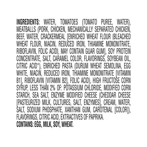 Water, Tomatoes (tomato Puree, Water), Meatballs (pork, Chicken, Mechanically Separated Chicken, Beef, Water, Crackermeal [enriched Wheat Flour {bleached Wheat Flour, Niacin, Reduced Iron, Thiamine Mononitrate, Riboflavin, Folic Acid), May Contain Guar Gum], Soy Protein Concentrate, Salt, Caramel Color, Flavorings, Soybean Oil, Citric Acid*), Enriched Pasta Durum Wheat Semolina, Egg White, Niacin, Reduced Iron, Thiamine Mononitrate [vitamin Bi], Riboflavin [vitamin B2] , Folic Acid), High Fructose Corn Syrup, Less Than 2% Of Potassium Chloride, Modified Corn Starch, Sea Salt, Enzyme Modified Cheese (cheddar Cheese [pasteurized Milk, Cultures, Salt, Enzymes], Cream, Water, Salt, Sodium Phosphate, Xanthan Gum, Carotenal [color]), Flavorings, Citric Acid, Extractives Of Paprika.