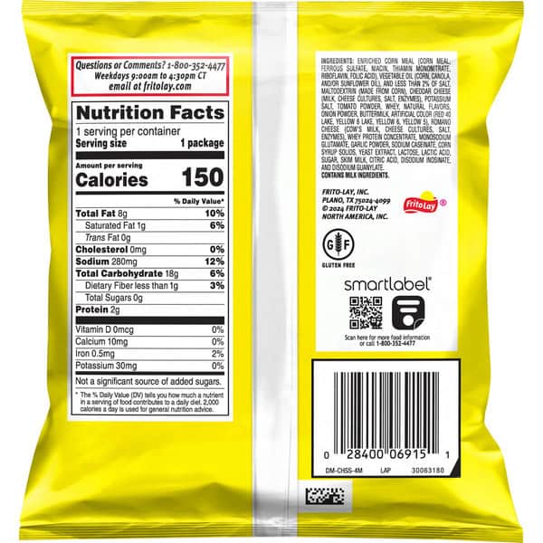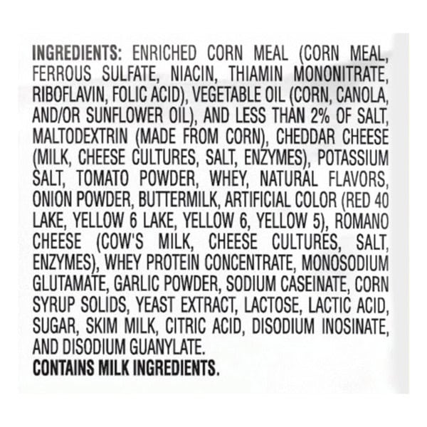Enriched Corn Meal (corn Meal, Ferrous Sulfate, Niacin, Thiamin Mononitrate, Riboflavin, Folic Acid), Vegetable Oil (corn, Canola, And/or Sunflower Oil), Dried Potatoes, Cheddar Cheese (milk, Cheese Cultures, Salt, Enzymes), Salt, Whey, Buttermilk, Monosodium Glutamate, Tomato Powder, Romano Cheese (part-skim Cow’s Milk, Cheese Cultures, Salt, Enzymes), Whey Protein Concentrate, Onion Powder, Artificial Color (red 40 Lake, Yellow 6 Lake, Yellow 6), Natural Flavor, Garlic Powder, Lactic Acid, Citric Acid, Sugar, Disodium Inosinate, And Disodium Guanylate.