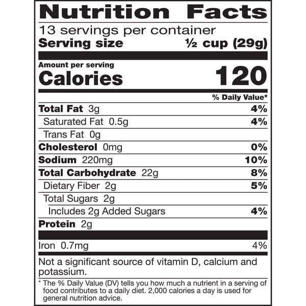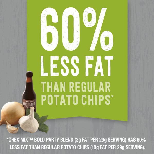 • FAMILY SIZE: A great choice for school snacks, a travel food, and more; Chex Mix Bold Party Blend (3g fat per 29g serving) has 60% less fat than regular potato chips (10g fat per 29g serving)