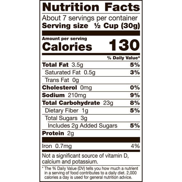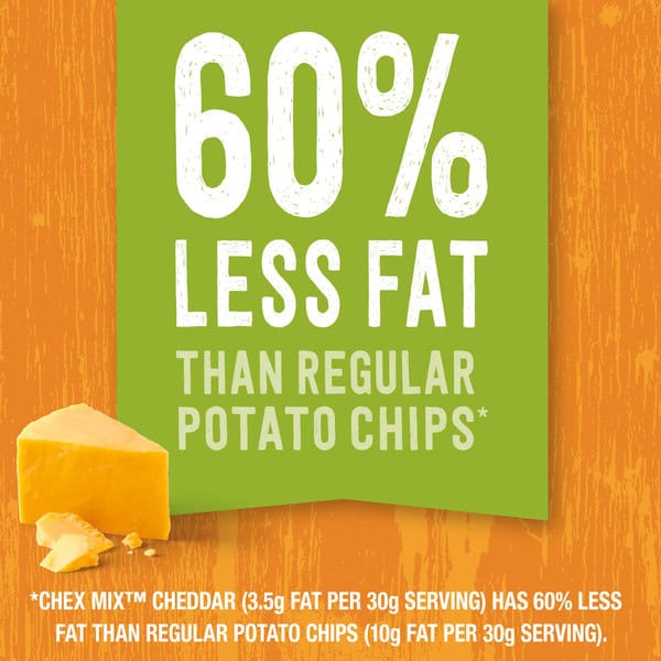 • 60% LESS FAT: Chex Mix Cheddar (3.5g fat per 30g serving) has 60% less fat than regular potato chips (10g fat per 30g serving); A great choice for school snacks, a travel food, and more