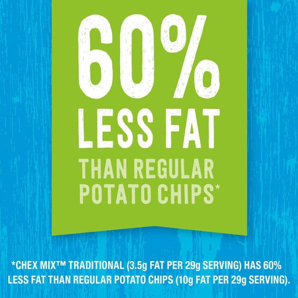 Your taste buds are wanting something savory. Your mind is bored with ordinary snack foods. Your hand reaches for Chex Mix Traditional Savory Snack Mix and voila – snack craving solved! Chex Mix party mix gives you a deliciously unpredictable combination of shapes, tastes and textures in every handful. Each serving contains 60% less fat than regular potato chips*. Pour some into a bowl as a party snack, or make it your go-to salty snack when friends come over. Grab a couple bags as tasty and convenient road trip snacks. Or stock your pantry so you have some handy for movie watching or gaming. With a unique crunch and flavor, Chex Mix brings variety to any occasion. *Chex Mix Traditional (3.5g fat per 29g serving) has 60% less fat than regular potato chips (10g fat per 29g serving).