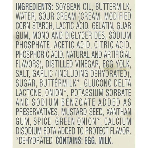 Soybean Oil, Buttermilk, Water, Sour Cream (cream, Modified Corn Starch, Lactic Acid, Gelatin, Guar Gum, Mono And Diglycerides, Sodium Phosphate, Acetic Acid, Citric Acid, Phosphoric Acid, Natural And Artificial Flavors), Distilled Vinegar, Egg Yolk, Salt, Garlic (including Dehydrated), Sugar, Buttermilk Powder, Glucono Delta Lactone, Dehydrated Onion, Potassium Sorbate And Sodium Benzoate Added As Preservatives, Mustard Seed, Xanthan Gum, Spice, Dehydrated Green Onion, Calcium Disodium Edta Added To Protect Flavor