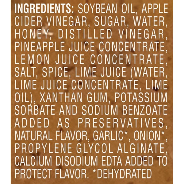 Soybean Oil, Apple Cider Vinegar, Sugar, Water, Honey, Distilled Vinegar, Pineapple Juice Concentrate, Lemon Juice Concentrate, Salt, Spice, Lime Juice (water, Lime Juice Concentrate, Lime Oil), Xanthan Gum, Potassium Sorbate And Sodium Benzoate Added As Preservatives, Natural Flavor, Garlic*, Onion*, Propylene Glycol Alginate, Calcium Disodium Edta Added To Protect Flavor, *dehydrated