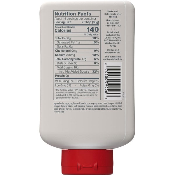 Sugar, Soybean Oil, Water, Corn Syrup, Corn Cider Vinegar, Distilled Vinegar, Tomato Paste, Salt, Paprika, Mustard Seed, Modified Cornstarch, Beet Juice, Onion*, Garlic*, Xanthan Gum, Propylene Glycol Alginate, Natural Flavor, *dehydrated