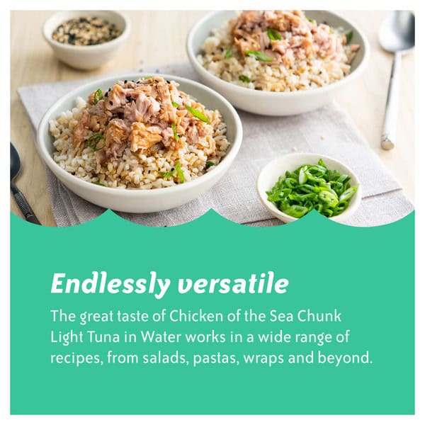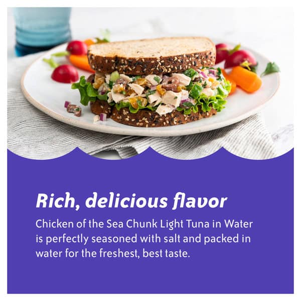 Chicken of the Sea chunk light tuna in water is perfectly seasoned with salt and packed in water for the freshest, best taste. It is high in protein and features heart-healthy omegas plus vitamins, and minerals—perfect for keto and Mediterranean diets.