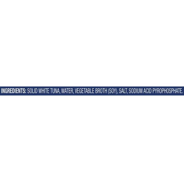 Solid White Tuna, Water, Vegetable Broth (contains Soy), Salt, Pyrophosphate.