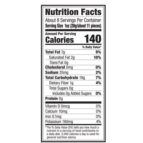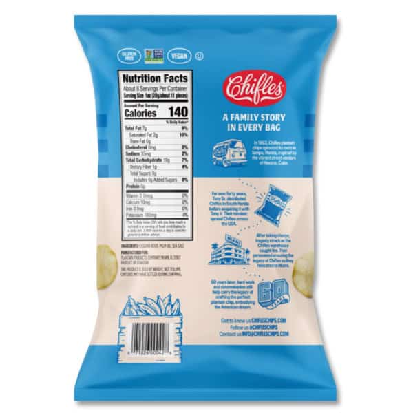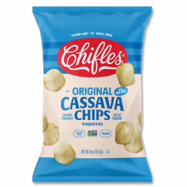 Per 28 g Serving: 130 calories; 0.5 g sat fat (3% DV); 70 mg sodium (3% DV); 0 g sugars. Gluten free. Vegan. No trans fat. Cholesterol free. Yuca. Crispy root vegetable chips. A crunch above the rest! At Chifles, we have a passion for turning traditional Latin treats into tasty, wholesome snacks. Our cassava chips have a delicious taste, hearty texture and satisfying crunch. They are a great alternative to run-of-the mill party snacks. This product is sold by weight, not volume. Contents may have settled during shipping. www.chifleschips.com. Connect with us at: Facebook: facebook.com/chifleschips. Twitter: (at)chifleschips. Instagram: (at)chifleschips. Now available online at www.chifleschips.com. Made in Ecuador.