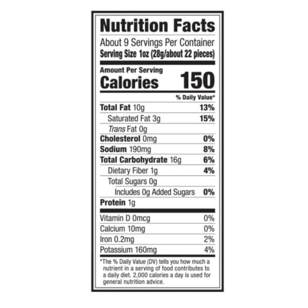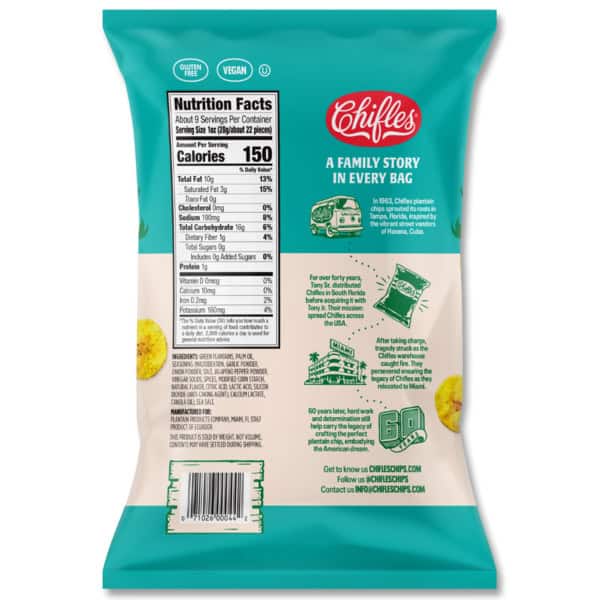 Green Plantains, Palm Oil, Seasoning (Maltodextrin, Garlic Powder, Onion Powder, Salt, Jalapeno Pepper Powder, Vinegar Solids, Spices, Modified Corn Starch, Natural Flavor, Citric Acid, Lactic Acid, Silicon Dioxide (Anti-Caking Agent), Calcium Lactate, Canola Oil), Sea Salt.