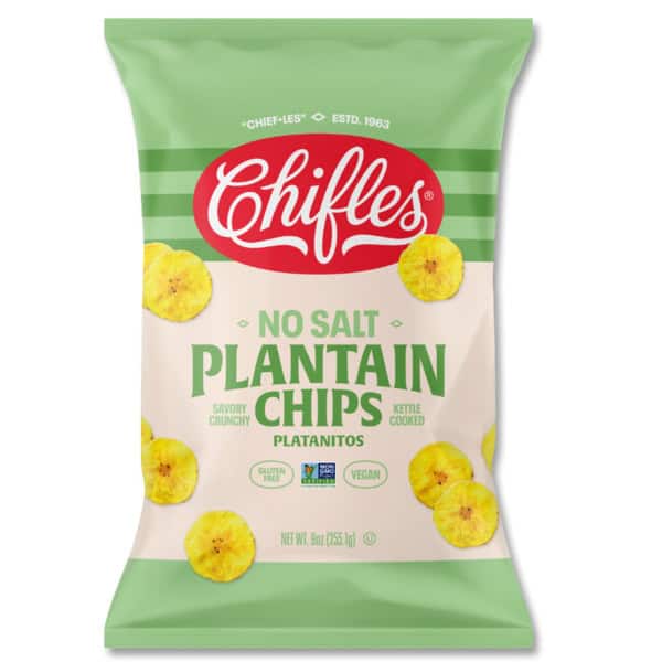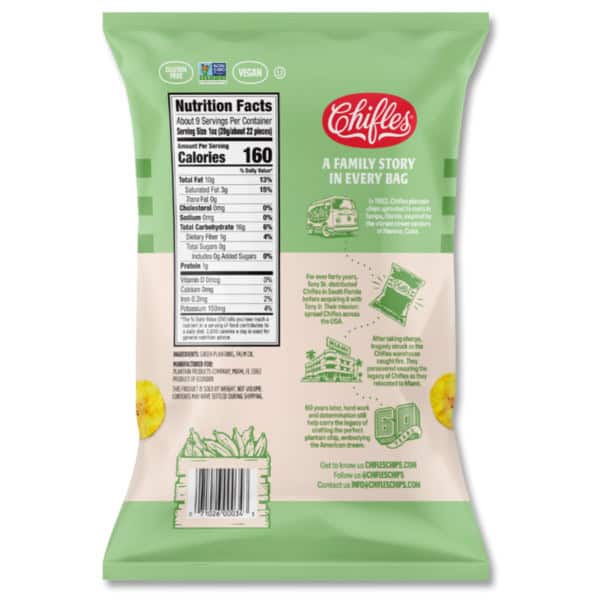 Per 28 g Serving: 150 calories; 1 g sat fat (5% DV); 0 mg sodium (0% DV); 0 g sugars. Gluten free. Vegan. Certified kosher. No trans fat. Cholesterol free. At Chifles, we have a passion for turning traditional Latin treats into tasty, wholesome snacks. More than a half-century after our founders began refining their recipe for the perfect plantain chip, we still place the highest value on quality. These savory snacks of crunch are unsalted and packaged while still warm. This product is sold by weight, not volume. Contents may have settled during shipping. www.chifleschips.com. Connect with us at: Facebook: facebook.com/chifleschips. Twitter: (at)chifleschips. Instagram: (at)chifleschips. Visit us at chicleschips.com. Now available online at www.chifleschips.com. Made in Ecuador.