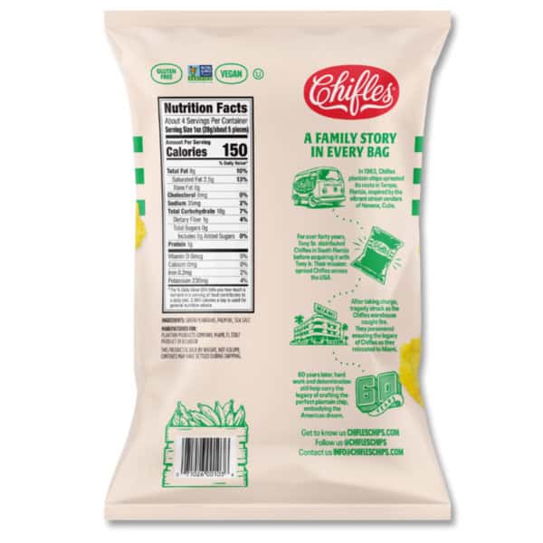 Thick and crunchy plantain chips. Per 28 g Serving: 150 calories; 2.5 g sat fat (13% DV); 40 mg sodium (2% DV); 0 g sugars. Gluten free. Certified kosher. Vegan. No trans fat. Cholesterol free. Ready to eat. A crunch above the rest! At Chifles, we have a passion for turning traditional Latin treats into tasty, wholesome snacks. More than a half-century after our founders began refining their recipe for the perfect plantain chip, we still place the highest value on quality. These savory snacks of crunch are cooked and seasoned with a pinch of salt and packaged while still warm. This product is sold by weight, not volume. Contents may have settled during shipping. www.chifleschips.com. Connect with us at: facebook.com/chifleschips. Twitter: (at)chifleschips. Instagram: (at)chifleschips. Email: info(at)chifleschips.com. Visit us at chifleschips.com. Now available online at www.chifleschips.com. Introducing our newest chip, Tostones. We’ve taken the traditional Latin staple, and turned it into a deliciously crunchy chip you can have at anytime! Made in Ecuador.
