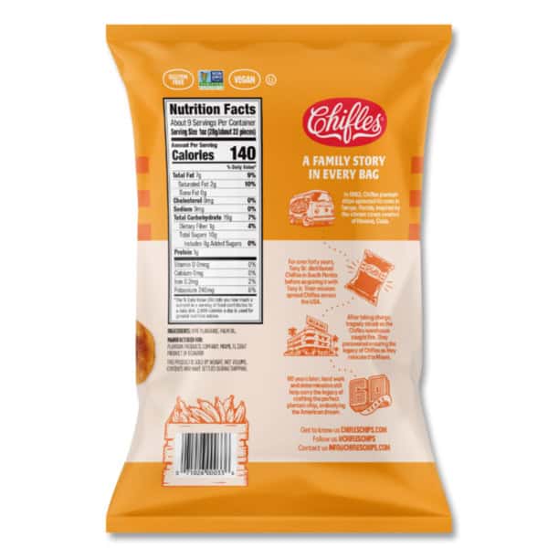 Per 28 g Serving: 140 calories; 2 g sat fat (10% DV); 0 mg sodium (0% DV); 5 g sugars. Gluten free. Certified kosher. Vegan. No trans fat. No sugar added. Cholesterol Free. At Chifles, we have a passion for turning traditional Latin treats into tasty, wholesome snacks. More than a half-century after our founders began refining their recipe for the perfect plantain chip, we still place the highest value on quality. By cooking a plantain when it’s done, we are able to capture its natural sweetness without adding sugar, making it a deliciously crunchy chip you can have at any time. This product is sold by weight, not volume. Contents may have settled during shipping. www.chifleschips.com. Connect with us at: Facebook: facebook.com/chifleschips. Twitter: (at)chifleschips. Instagram: (at)chifleschips. Visit us at chifleschips.com. Now available online at www.chifleships.com. Made in Ecuador.