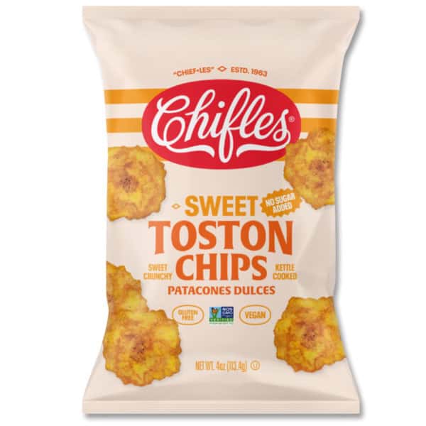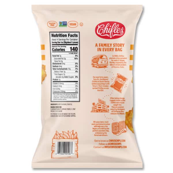 No sugar added. Ready to eat. A crunch above the rest! At Chifles, we have a passion for turning traditional Latin treats into tasty, wholesome snacks. More than a half-century after our founders began refining their recipe for the perfect plantain chip, we still place the highest value on quality. These savory snacks of crunch are cooked and seasoned with a pinch of salt and packaged while still warm. With our new Tostones, we’ve taken the traditional Latin staple and combined it with the natural sweetness of a ripe plantain, making it a deliciously crunchy chip you can have at any time! This product is sold by weight, not volume. Contents may have settled during shipping.