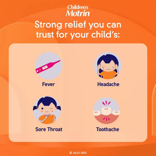 • Children’s Motrin Oral Suspension Liquid Medicine with Ibuprofen in a kid-friendly berry flavor
