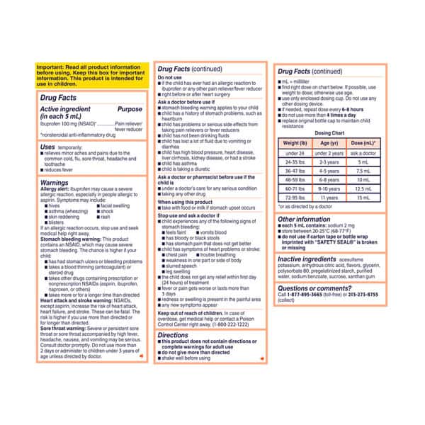 Stop use and ask a doctor if – child experiences any of the following signs of stomach bleeding, feels faint, vomits blood, has bloody or black stools, has stomach pain that does not get better, the child does not get any relief within first day (24 hours) of treatment, fever or pain gets worse or lasts more than 3 days, redness or swelling is present in the painful area, any new symptoms appear. Do not use – if the child has ever had an allergic reaction to any other pain reliever/fever reducer, right before or after heart surgery. Stomach bleeding warning: this product contains an nsaid, which may cause severe stomach bleeding. The chance is higher if your child: has had stomach ulcers or bleeding problems, takes a blood thinning (anticoagulant) or steroid drug, takes other drugs containing prescription or nonprescription nsaids (aspirin, ibuprofen, naproxen, or others), takes more or for a longer time than directed. Allergy alert: ibuprofen may cause a severe allergic reaction, especially in people allergic to aspirin. Symptoms may include: hives, facial swelling, asthma (wheezing), shock, skin reddening, rash, blisters, if an allergic reaction occurs, stop use and seek medical help right away. Ask a doctor or pharmacist before use if the child is – under a doctor’s care for any serious condition, taking any other drug. Keep out of reach of children. In case of overdose, get medical help or contact a poison control center right away. (1-800-222-1222). Ask a doctor before use if – stomach bleeding warning applies to your child, child has a history of stomach problems, such as heartburn, child has problems or serious side effects from taking pain relievers or fever reducers, child has not been drinking fluids, child has lost a lot of fluid due to vomiting or diarrhea, child has high blood pressure, heart disease, liver cirrhosis, or kidney disease, child has asthma, child is taking a diuretic. Sore throat warning: severe or persistent sore throat or sore throat accompanied by high fever, headache, nausea, and vomiting may be serious. Consult doctor promptly. Do not use more than 2 days or administer to children under 3 years of age unless directed by doctor. When using this product – take with food or milk if stomach upset occurs, the risk of heart attack or stroke may increase if you use more than directed or for longer than directed.”