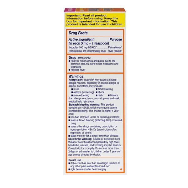 Stomach bleeding warning: this product contains an nsaid, which may cause severe stomach bleeding. The chance is higher if your child: has had stomach ulcers or bleeding problems, takes a blood thinning (anticoagulant) or steroid drug, takes more or drugs containing prescription or nonprescription nsaids (aspirin, ibuprofen, nanproxen, or others). Do not use – if the child has ever had an allergic reaction to any other pain reliever/fever reducer, right before or after heart surgery. Allergy alert: ibuprofen may cause a severe allergic reaction, especially in people allergic to aspirin. Symptoms may include: hives, facial swelling, asthma (wheezing), shock, skin reddening, rash, blisters if an allergic reaction occurs, stop use and seek medical help right away. Ask a doctor or pharmacist before use if the child is – under a doctor’s care for any serious condition, taking any other drug. Sore throat warning: severe or persistent sore throat or sore throat accompanied by high fever, headache, nausea, and vomiting may be serious, consult doctor promptly. Do not use more than 2 days or administer to children under 3 years of age unless directed by doctor. Keep out of reach of children. In case of overdose, get medical help or contact a poison control center right away. (1-800-222-1222). Ask a doctor before use if – stomach bleeding warning applies to your child, child has a history of stomach problems, such as heartburn, child has problems or serious side effects from taking pain relievers or fever reducers, child has not been drinking fluids, child has lost a lot of fluid due to vomiting or diarrhea, child has high blood pressure, heart disease, liver cirrhosis, or kidney disease, child has asthma, child is taking a diuretic. Stop use and ask a doctor if – child experiences any of the following signs of stomach bleeding feels faint, vomits blood, has stomach pain that does not get better, the child does not get any relief within first day (24 hours) of treatment, fever or pain gets worse or lasts more than 3 days, redness or swelling is present in the painful area, any new symptoms appear. When using this product – take with food or milk if stomach upset occurs, the risk of heart attack or stroke may increase if you use more than directed or for longer than directed.