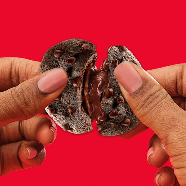 • Soft double chocolate chip cookies feature a delicious Hershey’s chocolate fudge filling.