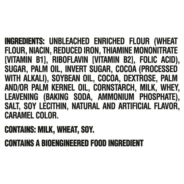 Unbleached Enriched Flour (wheat Flour, Niacin, Reduced Iron, Thiamine Mononitrate [vitamin B1], Riboflavin [vitamin B2], Folic Acid), Sugar, Palm Oil, Invert Sugar, Cocoa (processed With Alkali), Soybean Oil, Cocoa, Dextrose, Palm And/or Palm Kernel Oil, Cornstarch, Milk, Whey, Leavening (baking Soda, Ammonium Phosphate), Salt, Soy Lecithin, Natural And Artificial Flavor, Caramel Color.
