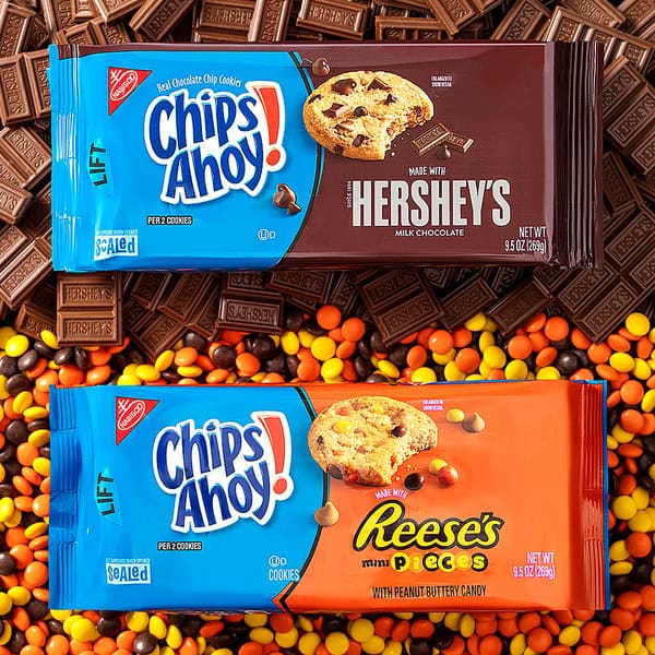 CHIPS AHOY! Chocolate Chip Cookies with Hershey’s Milk Chocolate are the CHIPS AHOY! cookies you know and love, baked to have the perfect amount of crunch but with a twist. A chocolate lover’s dream, these chocolate chip cookies also have the creamy goodness of Hershey’s Milk Chocolate. Enjoy these delicious sweet treats on their own with a glass of milk, as part of a dessert recipe or as an ice cream topper.