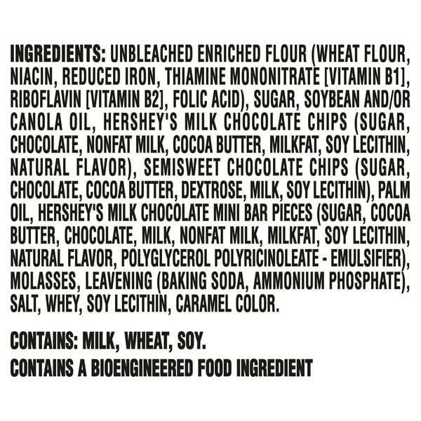 Unbleached Enriched Flour (wheat Flour, Niacin, Reduced Iron, Thiamine Mononitrate [vitamin B1], Riboflavin [vitamin B2], Folic Acid), Sugar, Soybean And/or Canola Oil, Hershey’s Milk Chocolate Chips (sugar, Chocolate, Nonfat Milk, Cocoa Butter, Milkfat, Soy Lecithin, Natural Flavor), Semisweet Chocolate Chips (sugar, Chocolate, Cocoa Butter, Dextrose, Milk, Soy Lecithin), Palm Oil, Hershey’s Milk Chocolate Mini Bar Pieces (sugar, Cocoa Butter, Chocolate, Milk, Nonfat Milk, Milkfat, Soy Lecithin, Natural Flavor, Polyglycerol Polyricinoleate – Emulsifier), Molasses, Leavening (baking Soda, Ammonium Phosphate), Salt, Whey, Soy Lecithin, Caramel Color.
