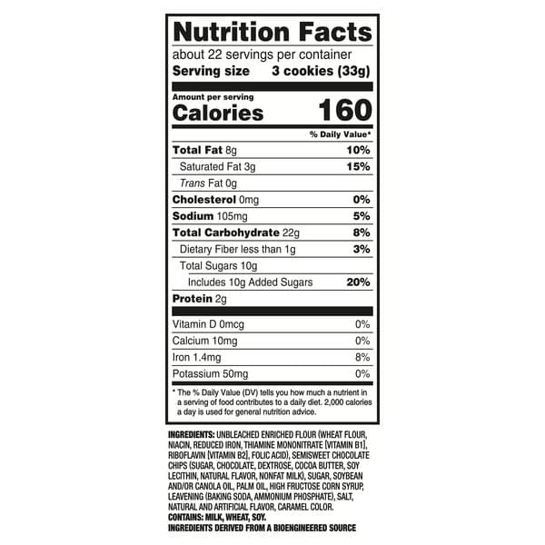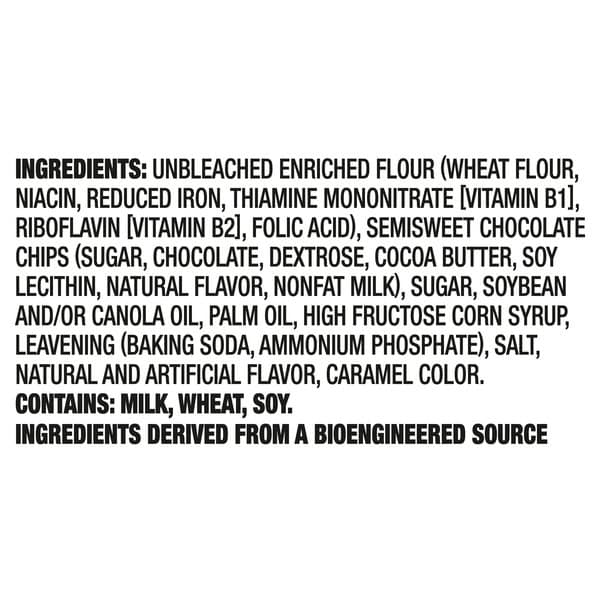 Unbleached Enriched Flour (wheat Flour, Niacin, Reduced Iron, Thiamine Mononitrate [vitamin B1], Riboflavin [vitamin B2], Folic Acid), Semisweet Chocolate Chips (sugar, Chocolate, Dextrose, Cocoa Butter, Soy Lecithin, Natural Flavor, Nonfat Milk), Sugar, Soybean And/or Canola Oil, Palm Oil, High Fructose Corn Syrup, Leavening (baking Soda, Ammonium Phosphate), Salt, Natural And Artificial Flavor, Caramel Color