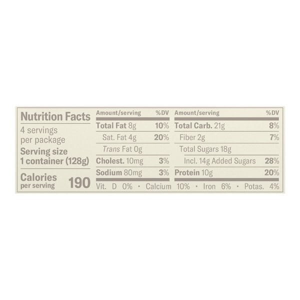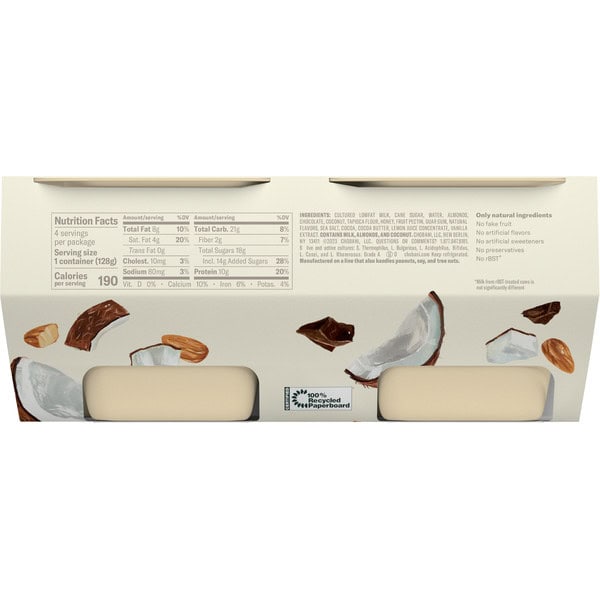 Cultured Lowfat Milk, Cane Sugar, Water, Almonds, Chocolate, Coconut, Tapioca Flour, Honey, Fruit Pectin, Guar Gum, Natural Flavors, Sea Salt, Cocoa, Cocoa Butter, Lemon Juice Concentrate, Vanilla Extract