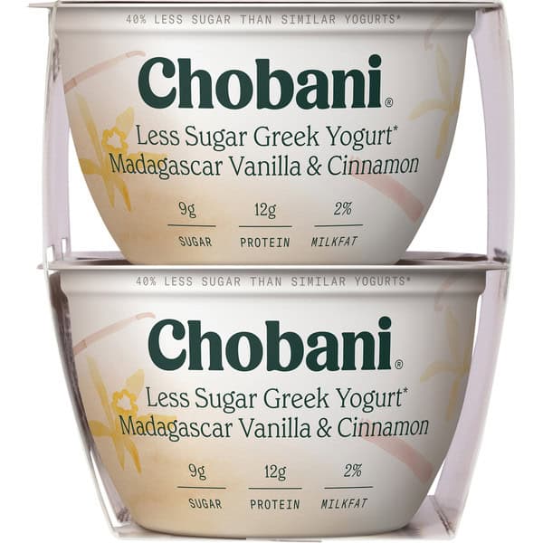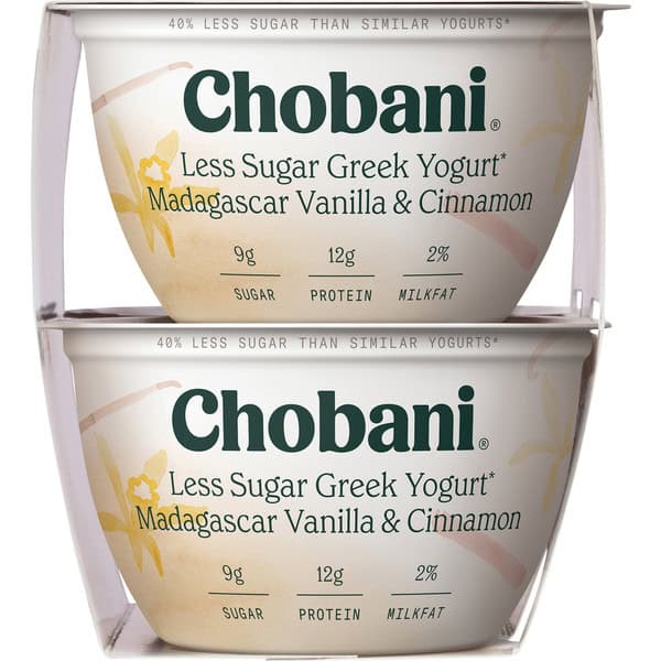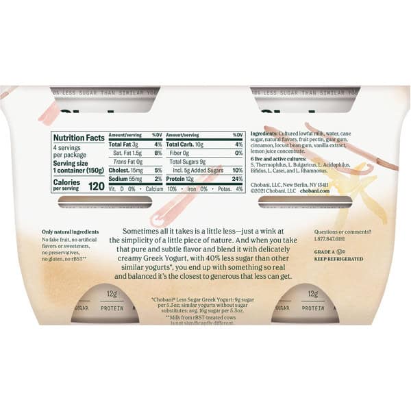 Low-fat Greek yogurt. No artificial flavors or artificial sweeteners. 9 g sugar. 12 g protein. Low-fat. No gluten. 2% milkfat. 45% less sugar than similar yogurts (Chobani less sugar greek yogurt: 9 g sugar per 5.3 oz; similar yogurts without sugar substitutes: avg. 17 g sugar per 5.3 oz). No GMO ingredients. No preservatives. No rBST (Milk from rBST-treated cows is not significantly different). Only natural ingredients. Sometimes all it takes is a little less-just a wink at the simplicity of a little piece of nature. And when you take that pure and subtle flavor and blend it with delicately creamy Greek Yogurt, with nearly half the sugar of other similar yogurts (Chobani less sugar Greek yogurt: 9 g sugar per 5.3 oz; similar yogurts without sugar substitutes: avg. 17 g sugar per 5.3 oz.), you end up with something so real and balanced it’s the closest to generous that less can get. Grade A. chobani.com. how2recycle.info. Questions or comments? 1.877.847.6181. A portion of profits for a better world. Sometimes all it takes is a little less—just a wink at the simplicity of a little piece of nature. And when you take that pure and subtle flavor and blend it with delicately creamy Greek yogurt, with nearly half the sugar of other yogurts*, you end up with something so real and balanced it’s the closest to generous that less can get.