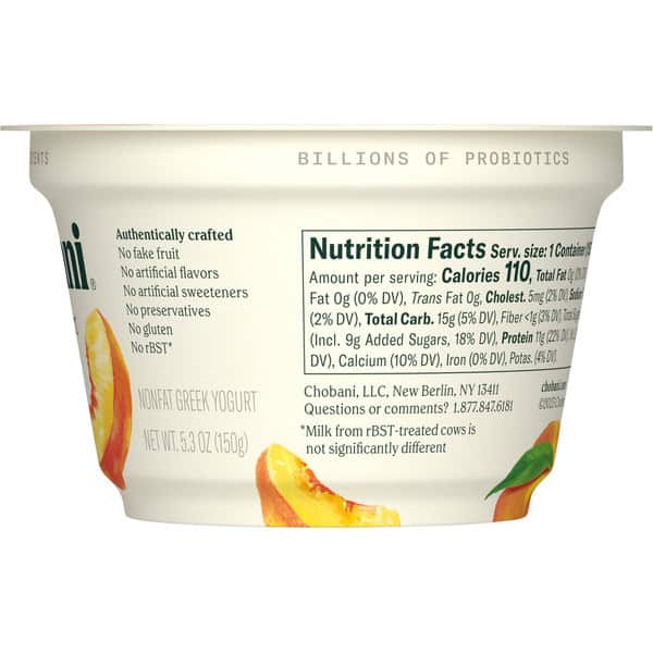 Non-fat Greek yogurt. No artificial flavors. No gluten. 0% milkfat. No GMO ingredients. Only natural ingredients. Billions of probiotics. 9 essential amino acids. Authentically crafted. No fake fruit. No artificial sweeteners. No preservatives. No rBST (According to the FDA, no significant difference has been shown between milk derived from rBST and milk derived from non-rBST cows). Grade A. chobani.com. Questions or comments? 1-877-847-6181. A portion of profits for a better world. Tear off label and recycle cup. A portion of profits for a better world.