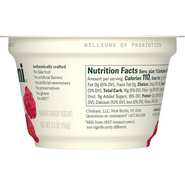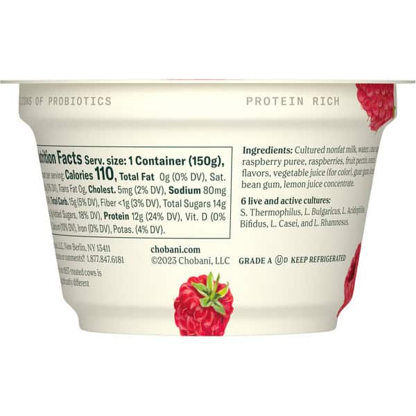 Chobani® Non-Fat Greek Yogurt Raspberry On The Bottom 0% Milk Fat.