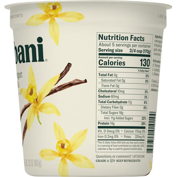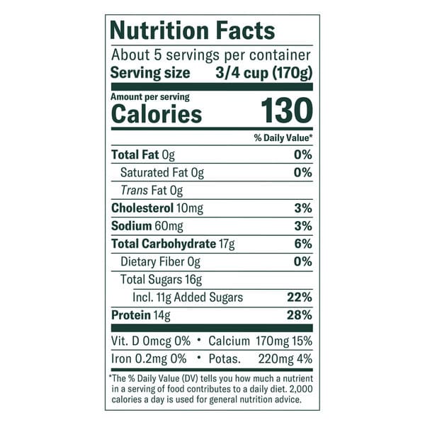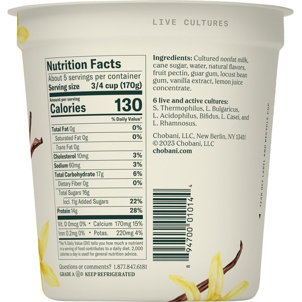 Cultured Nonfat Milk, Cane Sugar, Water, Natural Flavors, Fruit Pectin, Guar Gum, Locust Bean Gum, Vanilla Extract, Lemon Juice Concentrate