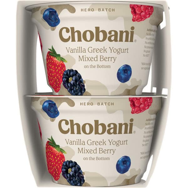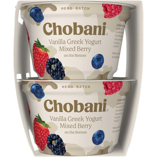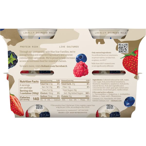 Vanilla Greek yogurt mixed berry on the bottom. Low fat. No gluten. 2% milkfat Protein rich. No GMO ingredients. Only natural ingredients. No artificial flavors or sweeteners, no preservatives, no fake fruit, no gluten, no rBST (Milk from rBST-treated cows is not significantly different). Grade A. chobani.com. how2recycle.info. Question or comments? 1.877.847.6181. Operation Homefront: Hero Batch: In partnership with Operation Homefront, we’ve raised over $2 million to support America’s military families. Through our partnership with Operation Homefront, we are proud to support their mission to serve America’s military families. Together, we’ve raised over $2 million to help our communities. To learn more, visit chobani.com/herobatch. Certified 100% recycled paperboard.