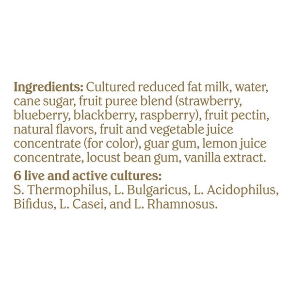 Cultured Lowfat Milk, Water, Cane Sugar, Fruit Puree Blend (strawberry, Blueberry, Blackberry, Raspberry), Fruit Pectin, Natural Flavors, Vanilla Extract, Locust Bean Gum, Lemon Juice Concentrate, Fruit And Vegetable Juice Concentrate (for Color), Guar Gum