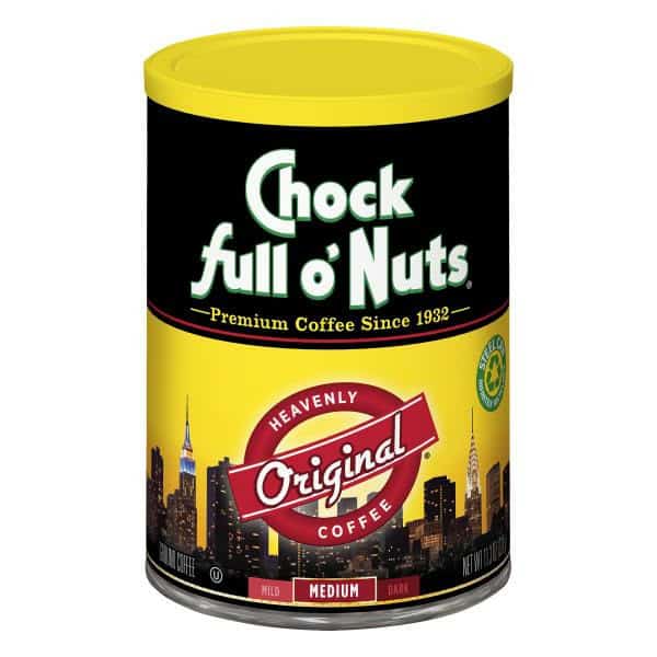 Premium coffee since 1932. Heavenly coffee. chockfullonuts.com. Instagram. Facebook. Twitter. Comments/questions call 1-888-246-2598. Steel can infinitely recyclable. Steel can infinitely recyclable. An infinitely better package: Steel: We think it’s infinitely better. Unlike plastic coffee tubs, steel can be recycled an infinite number of times and is the most recycled material on the planet. Not only is steel environmentally sustainable, its serves as a superior barrier to lock in fresh taste and prevent staleness. Think of it as a bank vault for fresh coffee. Of course, recycling only happen with your help. All you have to do it toss it in the bin. Don’t worry about checking for a recycling number – there’s not one. It’s not needed. Unlike plastic, all steel is recyclable. Everywhere. Forever. One taste and you’ll know why Chock full o’Nuts is the Heavenly Coffee.” With every cup of our medium-roasted Original blend, you’ll experience a smooth, full-bodied flavor we’re proud to call our own since 1932.