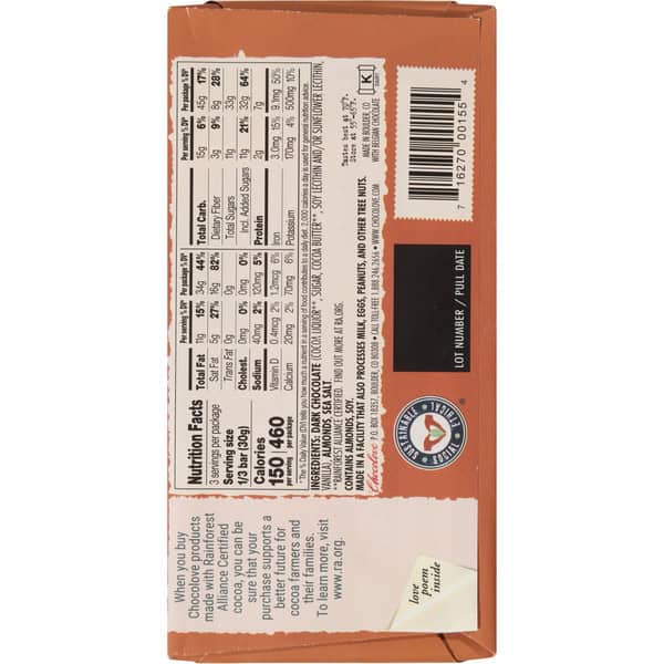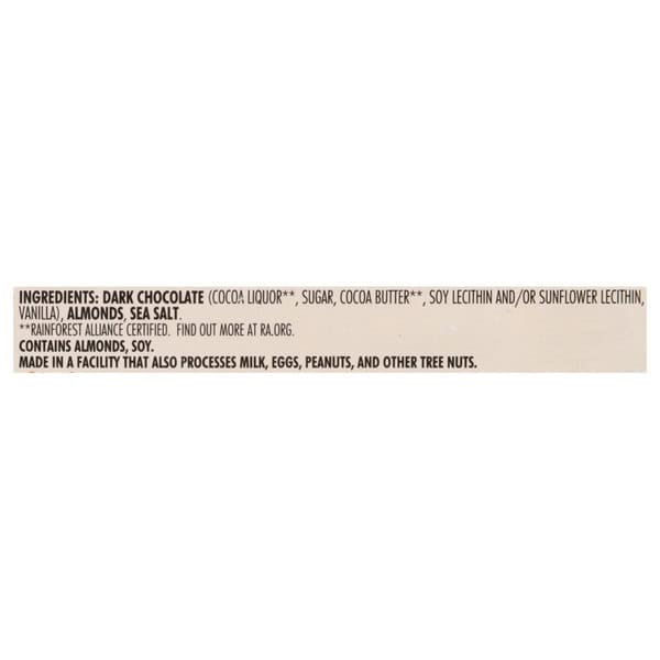 Dark Chocolate (cocoa Liquor**, Sugar, Cocoa Butter**, Soy Lecithin And/or Sunflower Lecithin, Vanilla), Almonds, Sea Salt. ** Rainforest Alliance Certified. Find Out More At Ra.org.
